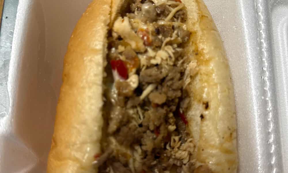 Shaved Ribeye Steak, Grilled Onions, Peppers, & Melted Cheese on a Hoagie Roll.